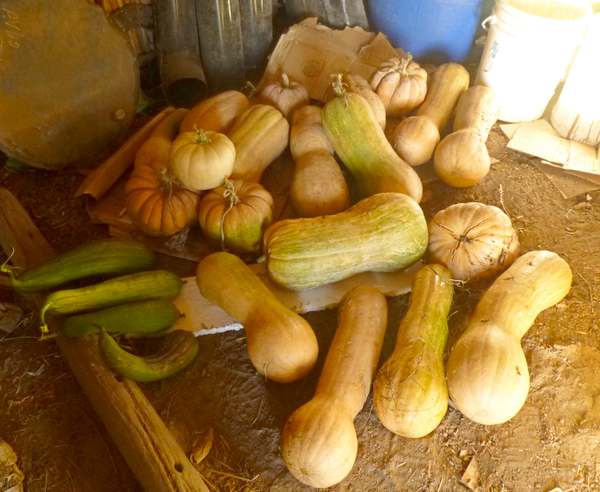The younger brother of our albeñil (mason/contractor) said the yellow squash and pumpkins should be brought in before the last rain, so I did last week. Except for the six in the foreground I found today. Yes, you would think they’d be hard to miss.