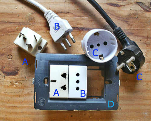 If you do some of your own wiring, note that a mounting frame D from Argentina will not work with sockets from Uruguay (A & B), and vice versa. The width discrepancy amounts to a millimeter or less – way to go, guys! And (of course) Argentinian hardware is not widely sold in Uruguay. We bought our house from someone who built it with (cheaper) hardware he carried from Buenos Aires, which is why I know.