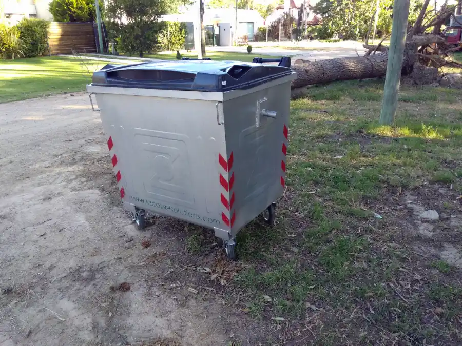 A new trash container appears, sourced locally and looking more solid than the older ones from Europe somewhere.