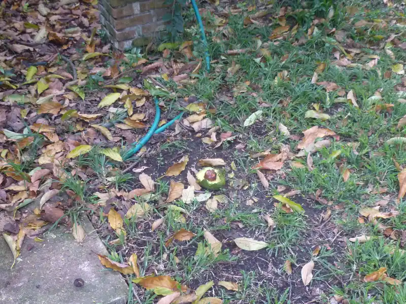 So what do I find this morning but a freshly-fallen avocado, freshly devoured. Huh?